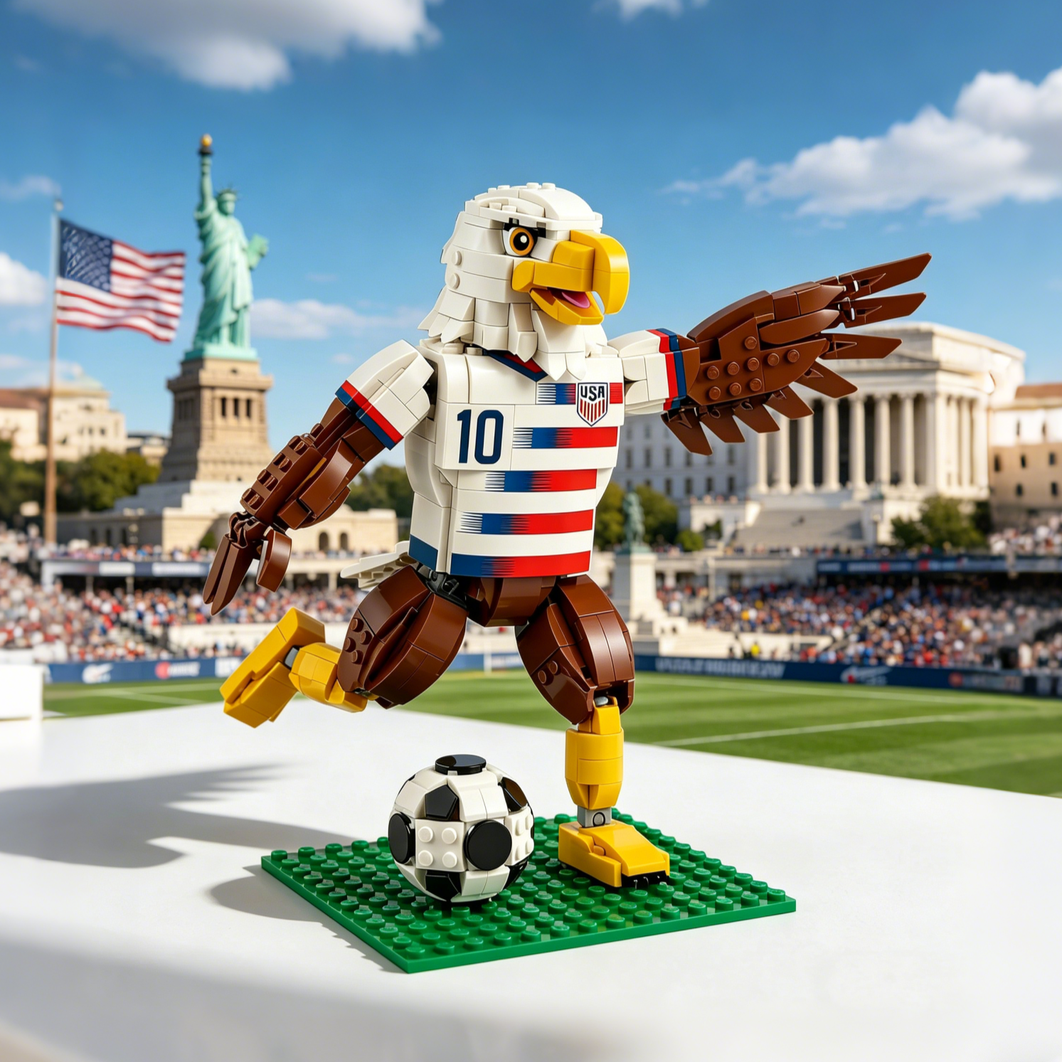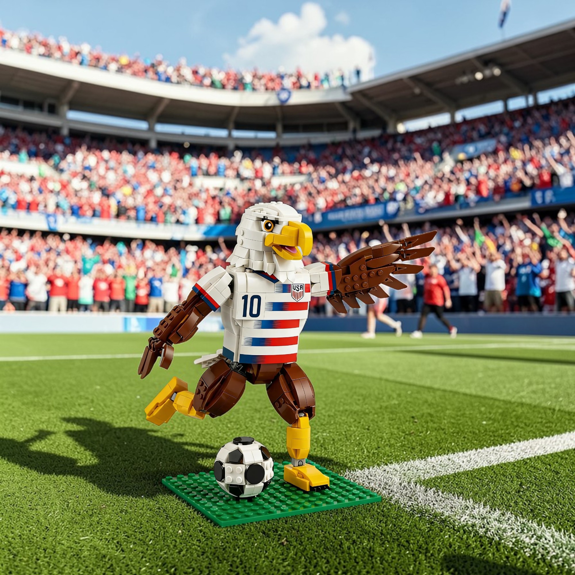 This exclusive limited-edition brick set celebrates the unyielding passion and national pride of American soccer culture. It features a dynamic bald eagle mascot build, classic red-white-blue soccer jersey details, and authentic matchday-inspired elements, perfect for soccer fans and brick hobbyists to build, play and proudly display.